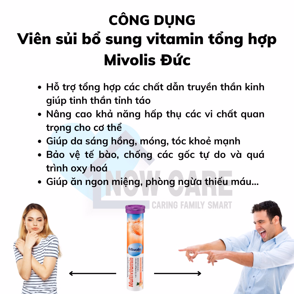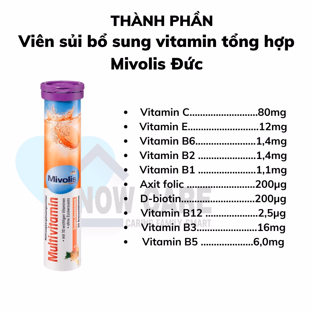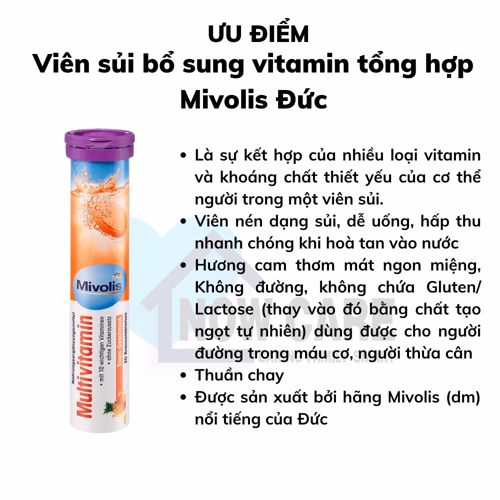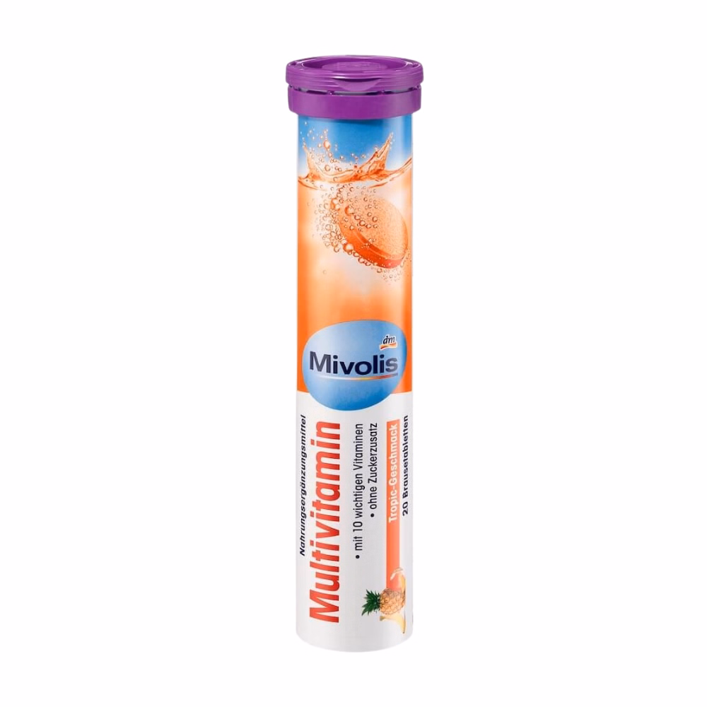 Viên sủi bổ sung vitamin tổng hợp Mivolis multivitamin bổ sung 10 loại Vitamin thiết yếu mỗi ngày cho cơ thể , giúp tăng sức đề kháng, ăn ngon miệng, sáng da, phòng ngừa thiếu máu…Hương cam thơm mát ngon miệng, Không đường, không chứa Gluten/ Lactose (thay vào đó bằng chất tạo ngọt tự nhiên), thuần chay.