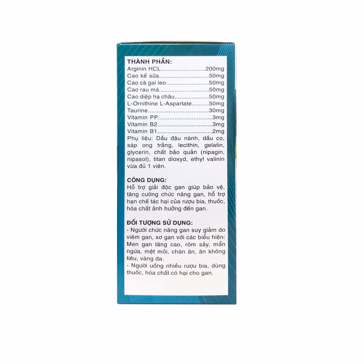 Thành phần: Arginin Hcl 200 mg, cao kế sữa 50 mg, cao cà gai leo 50 mg, cao rau má 50 mg, cao diệp hạ châu 50 mg, L-ornithine L-Aspartate 50 mg, Taurine 30 mg, Vitamin Pp 3 mg, Vitamin B2 3 mg, Vitamin B1 2 mg.