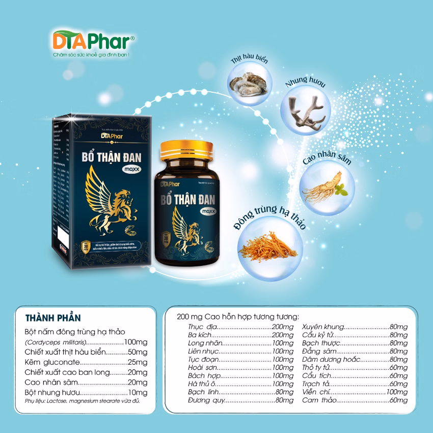 Thành phần: Bột nấm đông trùng hạ thảo, chiết xuất thịt hàu biển, kẽm gluconate, chiết xuất cao ban long, cao nhân sâm, bột nhung hươu, thục địa, ba kích, long nhãn, liên nhục, tục đoạn, hoài sơn, bách hợp, hà thủ ô, bạch linh, đương quy, xuyên khung, câu kỷ tử, bạch thược, đẳng sâm, đâm dương hoắc, thỏ ty tử, cẩu tích, trạch tả, viễn chí, cam thảo