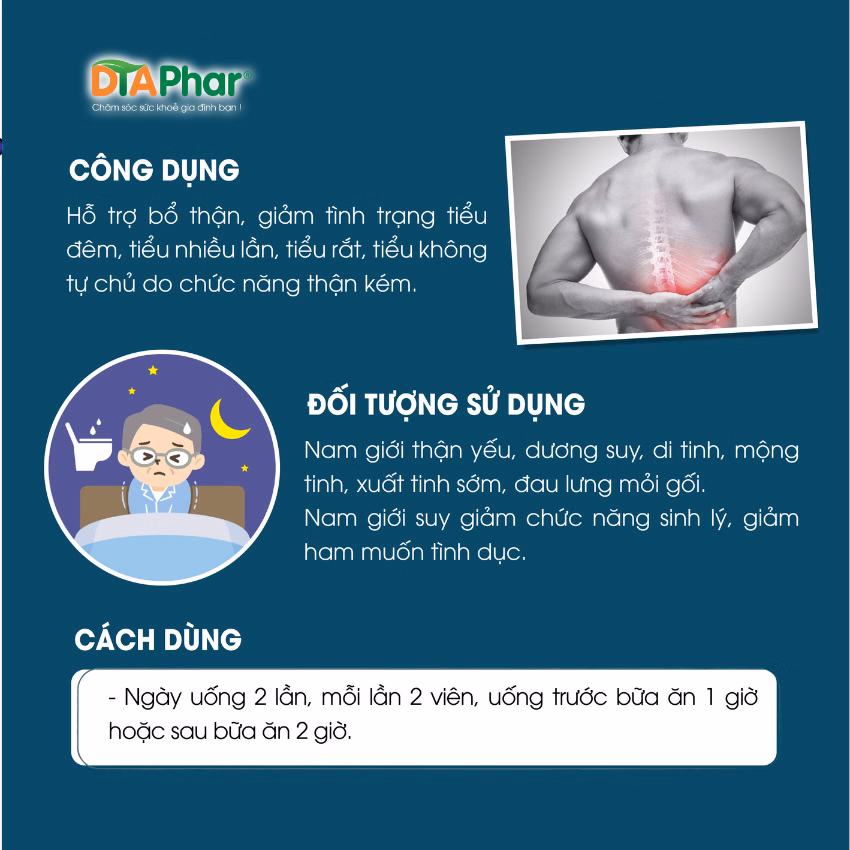 Dùng cho nam giới và nữ giới có chức năng thận kém gây tiểu rắt, tiểu đêm, tiểu nhiều lần, tiểu không tự chủ.