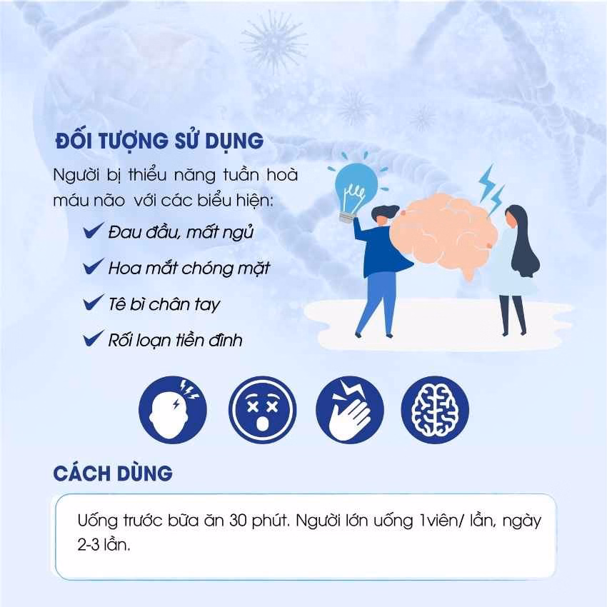 Viên uống giúp hoạt huyết dưỡng não, tăng cường tuần hoàn não và lưu thông máu não. Hỗ trợ làm giảm các triệu chứng thiểu năng tuần hoàn máu não như đau đầu mất ngủ, hoa mắt, chóng mặt, tê bì chân tay, rối loạn tiền đình.