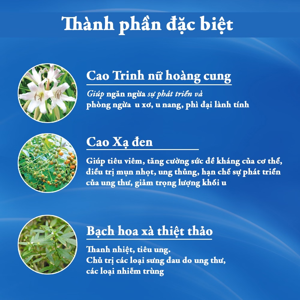 Thành phần: Cao Trinh nữ hoàng cung, Cao Xạ đen, Cao Bạch hoa xà thiệt thảo, Cao Bán chi liên, Novasol Curcumin, bột linh chi, bột tam thất, phụ liệu: Magie Stearat, Talc… vừa đủ 1 viên.