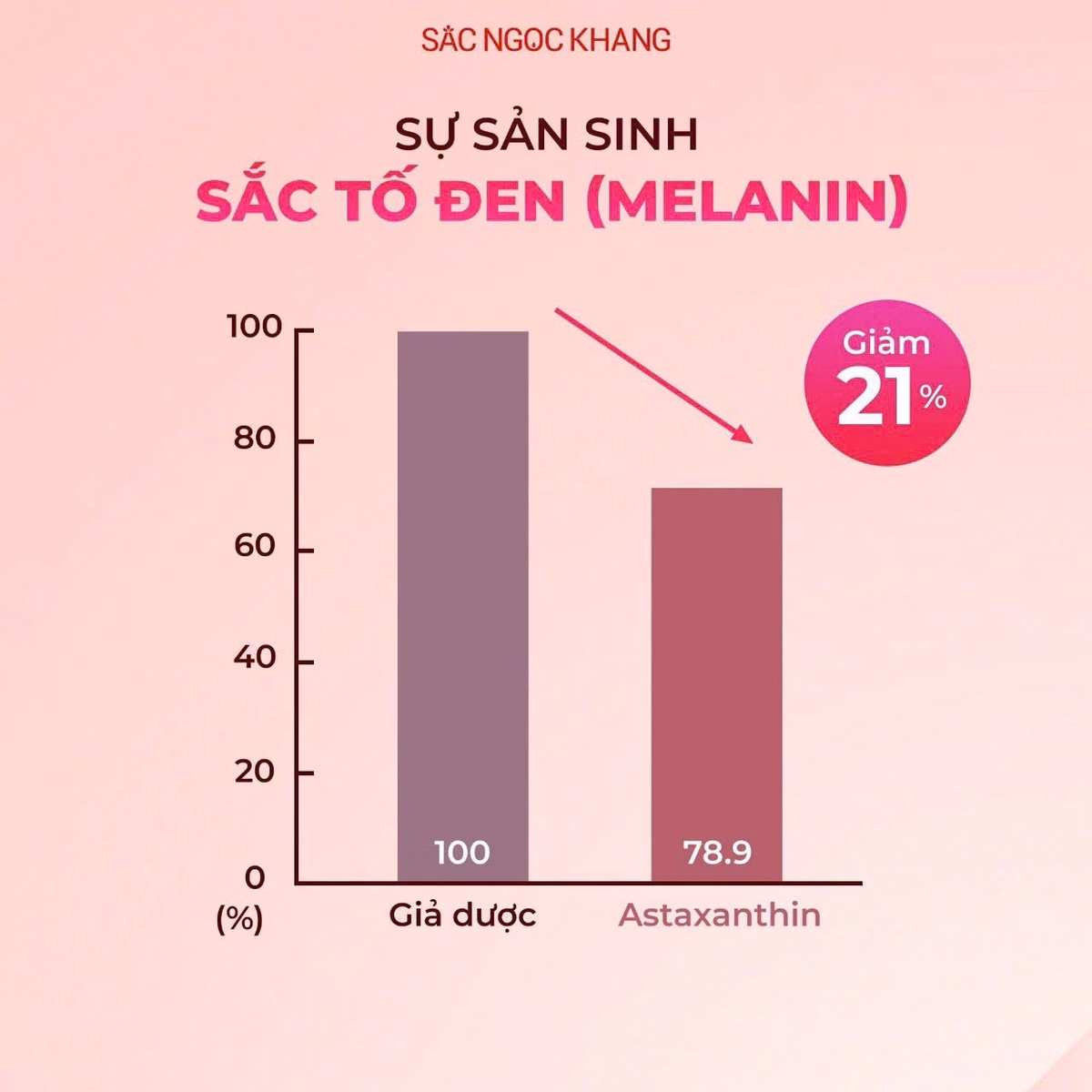 – Astaxanthin từ Vi Tảo Lục Nhật Bản được chứng minh có khả năng chống oxy hóa gấp 110 lần so với Vitamin E, gấp 6000 lần so với Vitamin C, cho tác động ức chế quá trình hình thành sắc tố đen, đào thải nám, sạm, tàn nhang, giúp da luôn căng mịn, tràn đầy sức sống. Không những giúp làm đẹp da, Astaxanthin còn giúp ngăn ngừa tác hại của các gốc tự do sản sinh, làm chậm quá trình lão hóa, giúp cơ thể trẻ khỏe. Đặc biệt, Astaxanthin trong Viên uống Sắc Ngọc Khang ++ được nhập khẩu từ Tập đoàn Astareal Nhật Bản (Tập đoàn Top đầu thế giới với hơn 70 năm nghiên cứu chuyên sâu và nuôi trồng Astaxanthin tự nhiên).