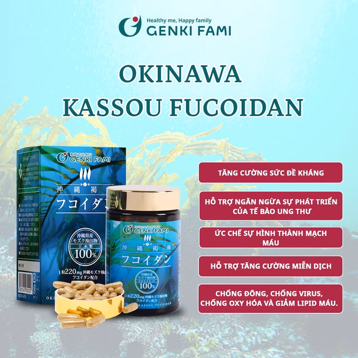 Viên uống tăng đề kháng và hỗ trợ điều trị ung thư Fucoidan – Genki Fami 100% chiết xuất Fucoidan từ tảo Mozuku, Okinawa.