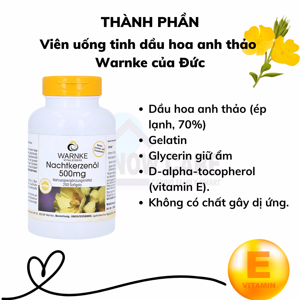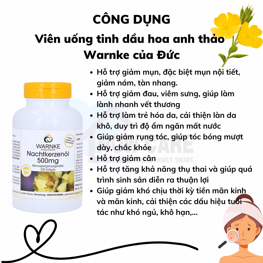 Viên uống tinh dầu hoa anh thảo Warnke Nachtkerzenöl 500mg là sản phẩm của hãng Warnke – Đức, hỗ trợ bổ sung dinh dưỡng với vitamin E tự nhiên và các axit béo axit linoleic, axit gamma-linolenic có hiệu quả cho sức khỏe. Viên uống hỗ trợ cân bằng nội tiết nữ, hỗ trợ làm đẹp da, giảm nám da, hỗ trợ cải thiện các vấn đề liên quan đến tiền mãn kinh, mãn kinh.