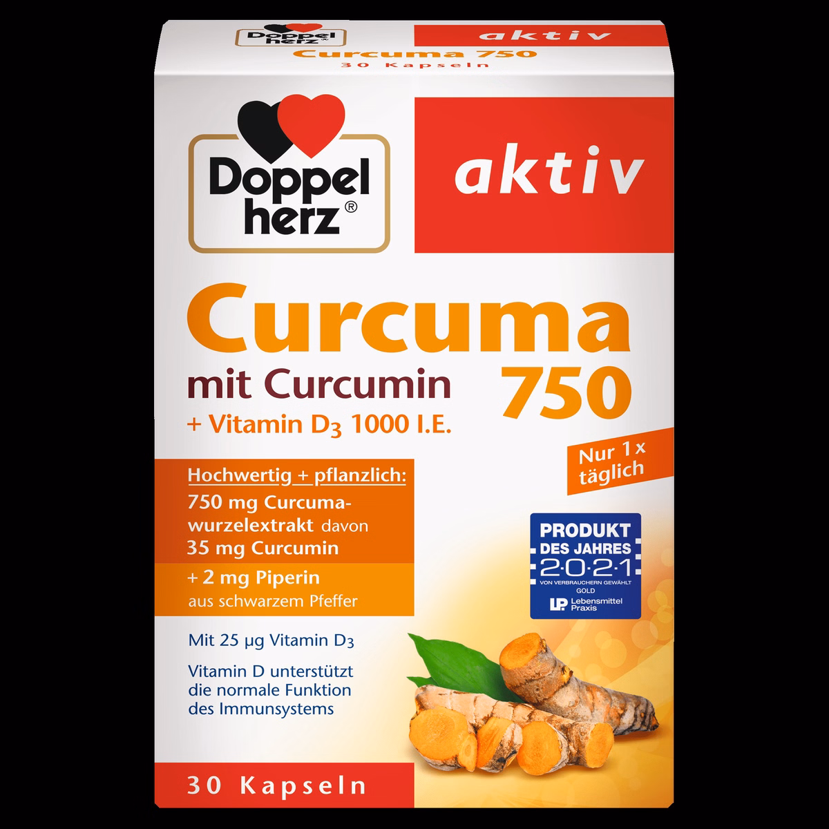 Viên tinh bột nghệ Doppelherz Curcuma 750 chứa 750 mg chiết xuất từ củ nghệ chất lượng cao (từ Curcuma Longa L.) với hàm lượng curcumin tự nhiên là 35 mg kết hợp với 2 mg piperine và 25 μg vitamin D3, tương ứng với 1000 Iu (đơn vị quốc tế).