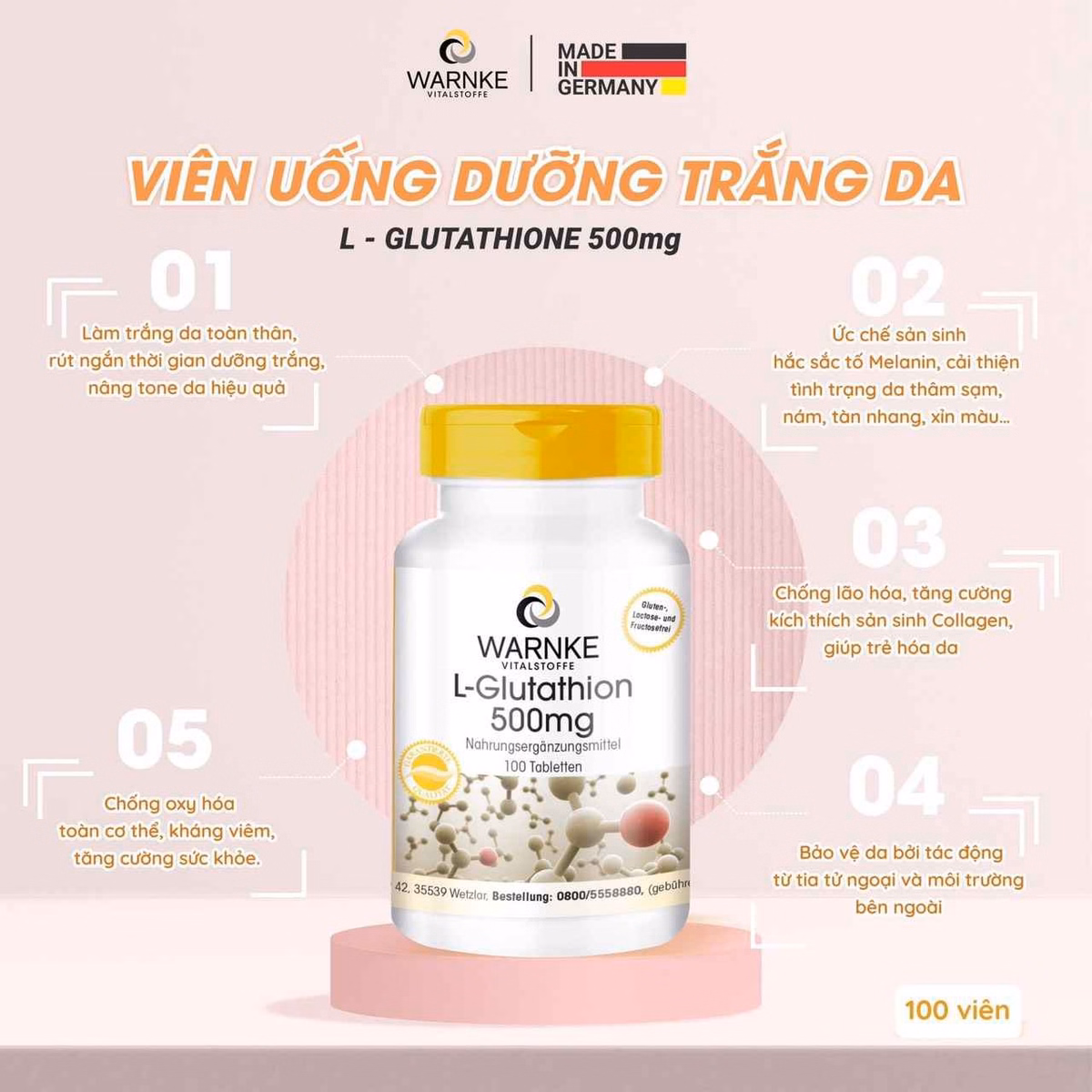 Viên uống trắng da Warnke L-Glutathione Đức lọ 100 viên của Đức là giải pháp hiệu quả cải thiện làn da xỉn tối màu, giúp dưỡng trắng tối ưu từ bên trong, rút ngắn thời gian dưỡng trắng, nâng tông da hiệu quả.