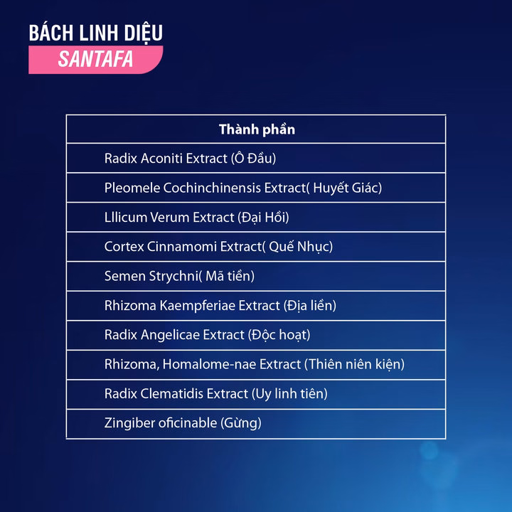 Huyết giác, thiên niên kiện, mã tiền, ô đầu, độc hoạt, đại hồi, địa liền, huyết giác, quế nhục, uy linh tiên, gừng, methyl salicylate.