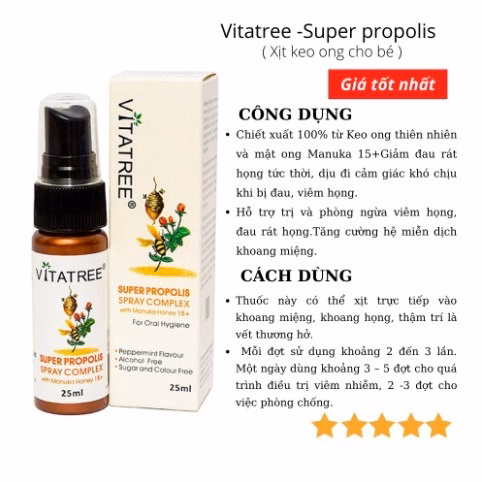 Chai xịt keo ong Vitatree là sản phẩm được chiết xuất từ Propolis thiên nhiên kết hợp với mật ong giúp hỗ trợ tốt các vấn đề về hô hấp, giúp đẩy lùi cơn ho ngay lập tức, làm dịu cảm giác đau rát do viêm họng hoặc các vết loét miệng và các triệu chứng cảm lạnh khác. Xịt keo ong Úc Vitatree thích hợp sử dụng cho bé từ 2 tuổi trở lên. Sản phẩm được nhiều khách hàng tin dùng hàng đầu tại Úc.