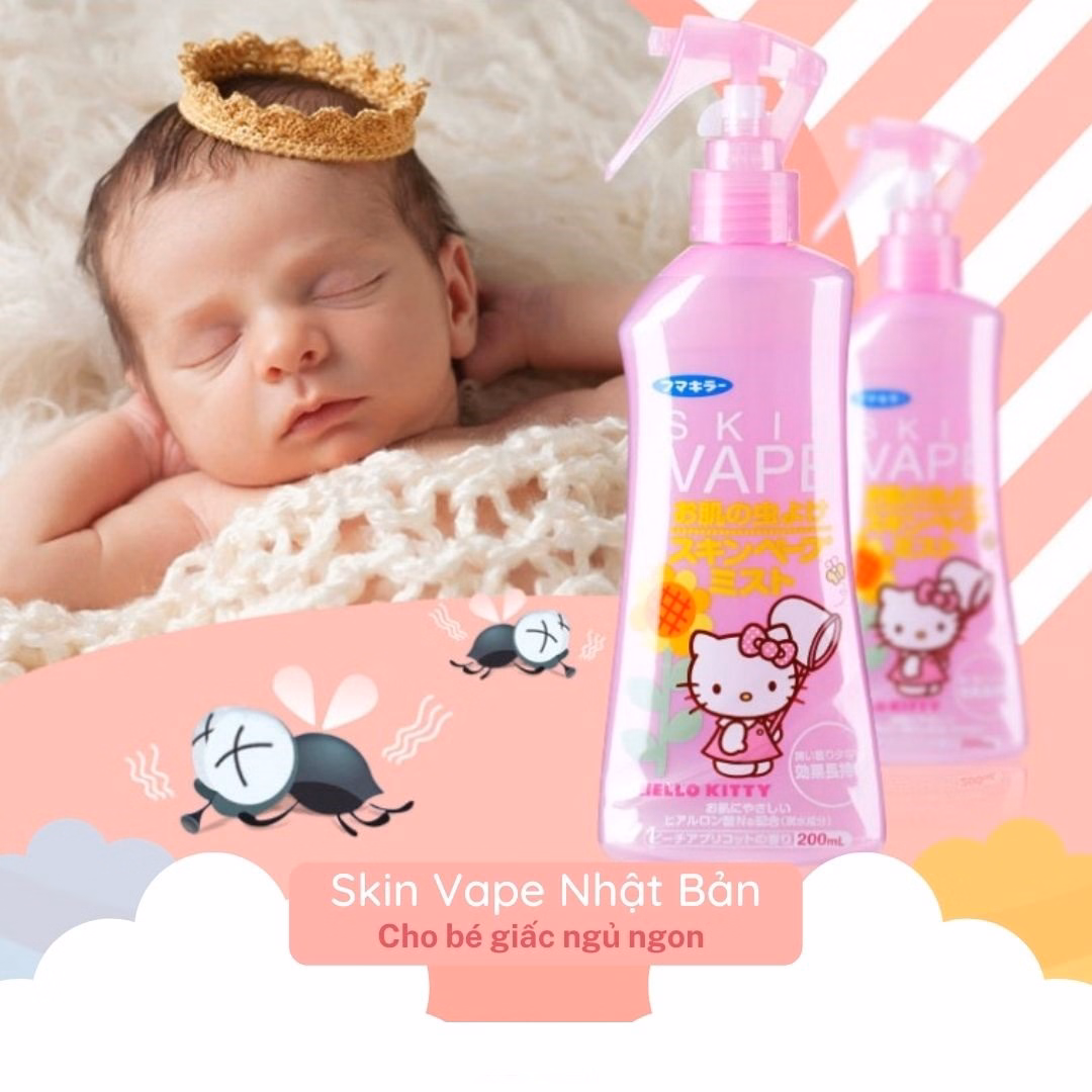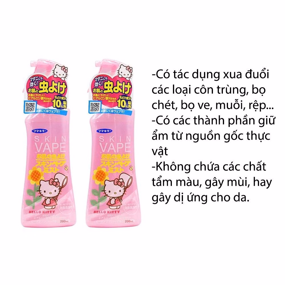 Chai xịt phun sương Hello Kitty Skin Vappe có tính chất nhẹ nhàng, tiện dụng bảo vệ da bé khỏi muỗi và các loài côn trùng đốt, có công dụng trong thời gian dài.